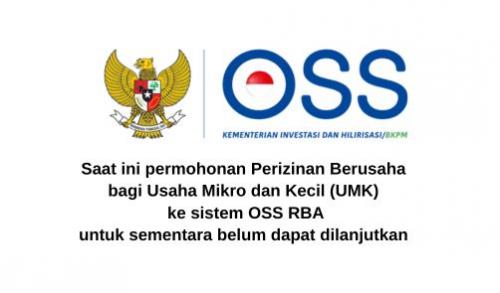 Saat ini permohonan Perizinan Berusaha  untuk Usaha Mikro dan Kecil (UMK) / pengajuan Nomor Induk Berusaha (NIB) masih dilakukan penyesuaian fitur sistem mengikuti ketentuan PP No. 28 Tahun 2025 oleh Kementerian Investasi dan Hilirisasi/BKPM, sehingga permohonan anda ke sistem OSS RBA untuk sementara belum dapat dilanjutkan. Untuk itu silakan melakukan pengecekan ...