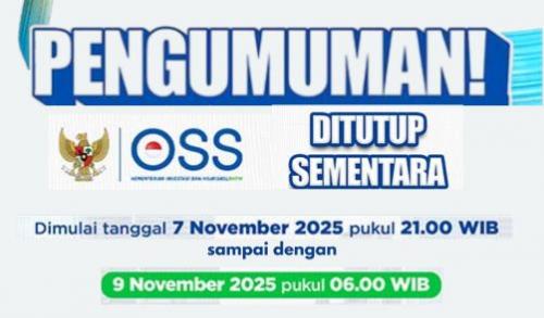 Sistem OSS RBA tidak dapat diakses 7 November 2025 jam 21.00 s.d 9 November 2025 jam 06.00 WIB