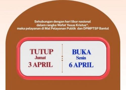 Sehubungan dengan hari libur nasional dalam rangka Wafat Yesus Kristus*, maka pelayanan di Mal Pelayanan Publik  dan DPMPTSP Bantul (layanan, konsultasi, pengaduan via tatap muka, WA, telepon, media sosial, dan online): Tutup: Jumat 3 April 2026 Buka kembali: Senin 6 April 2026 Adapun Informasi seputar  layanan perizinan berusaha dan non berusaha, dapat anda lihat di ...