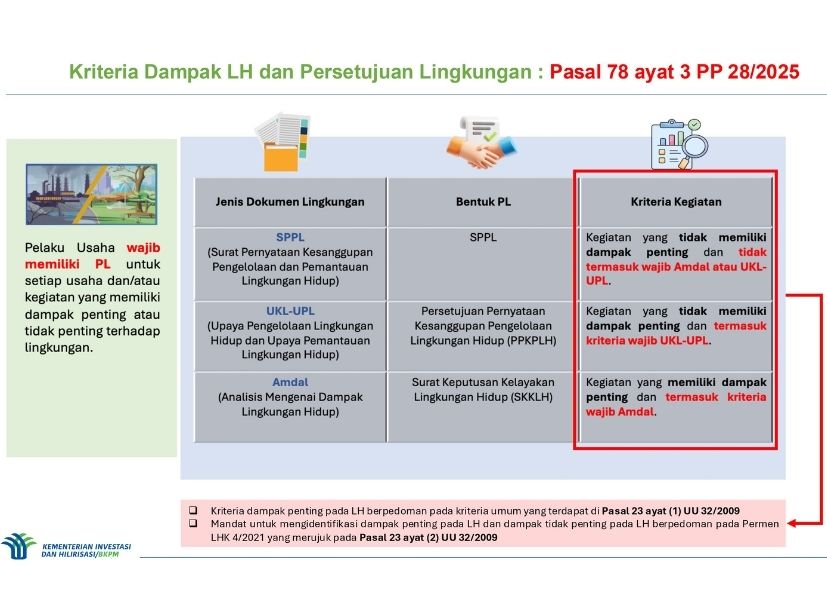 "Ketika kita bicara soal persetujuan lingkungan, kita tidak berbicara soal bagaimana menyambung-nyambungkan antara tingkat risiko antara perizinan berusaha dengan dampak lingkungan, karena itu 2 hal yang berbeda. Dan itu yang berusaha untuk didamaikan melalui PP 28 tahun 2025.